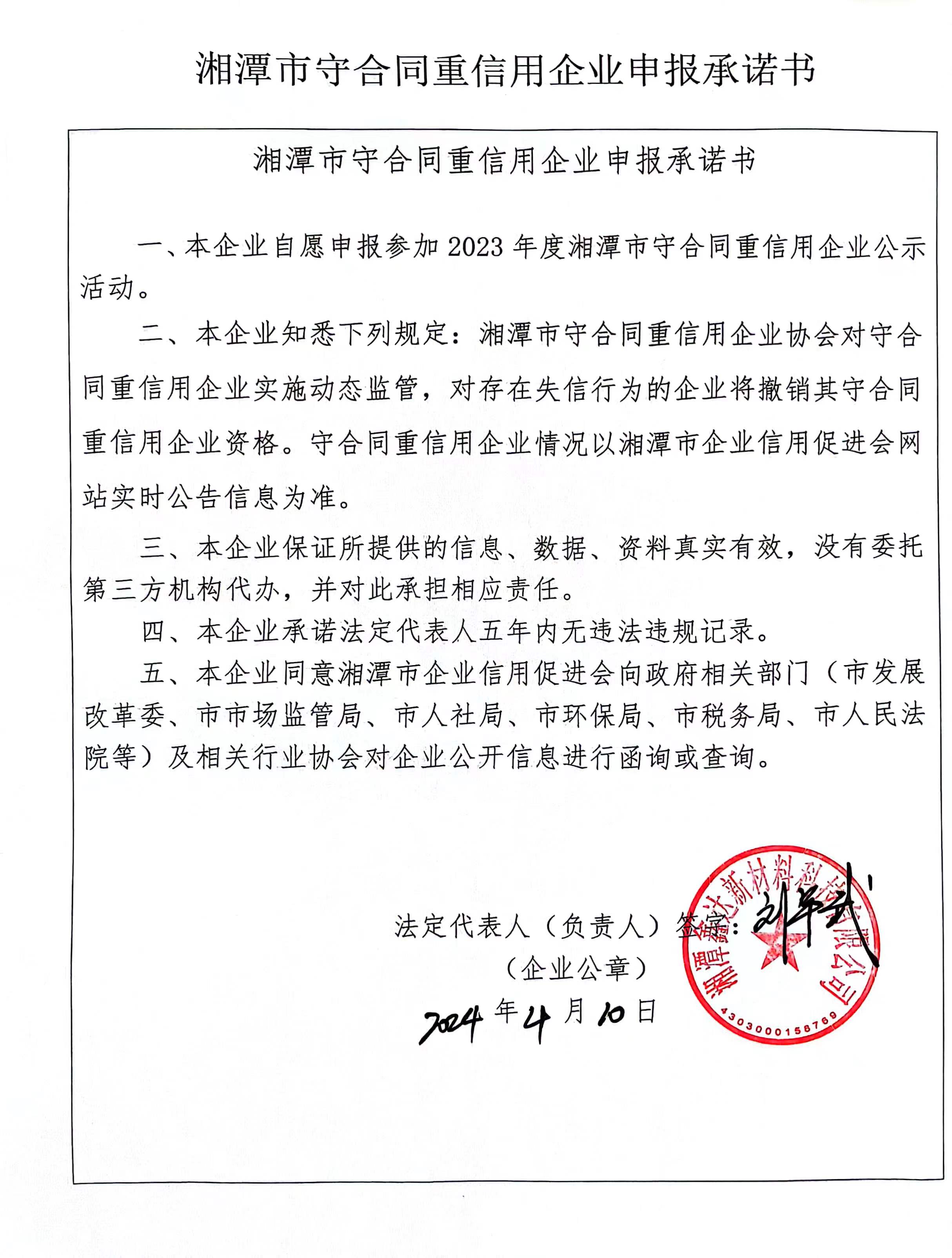 本企業(yè)根據(jù)《湘潭市守合同重信用企業(yè)申報規(guī)定》等編制 2023 年度企業(yè)信用報告書,并保證本報告書內容真實、準確、完整。