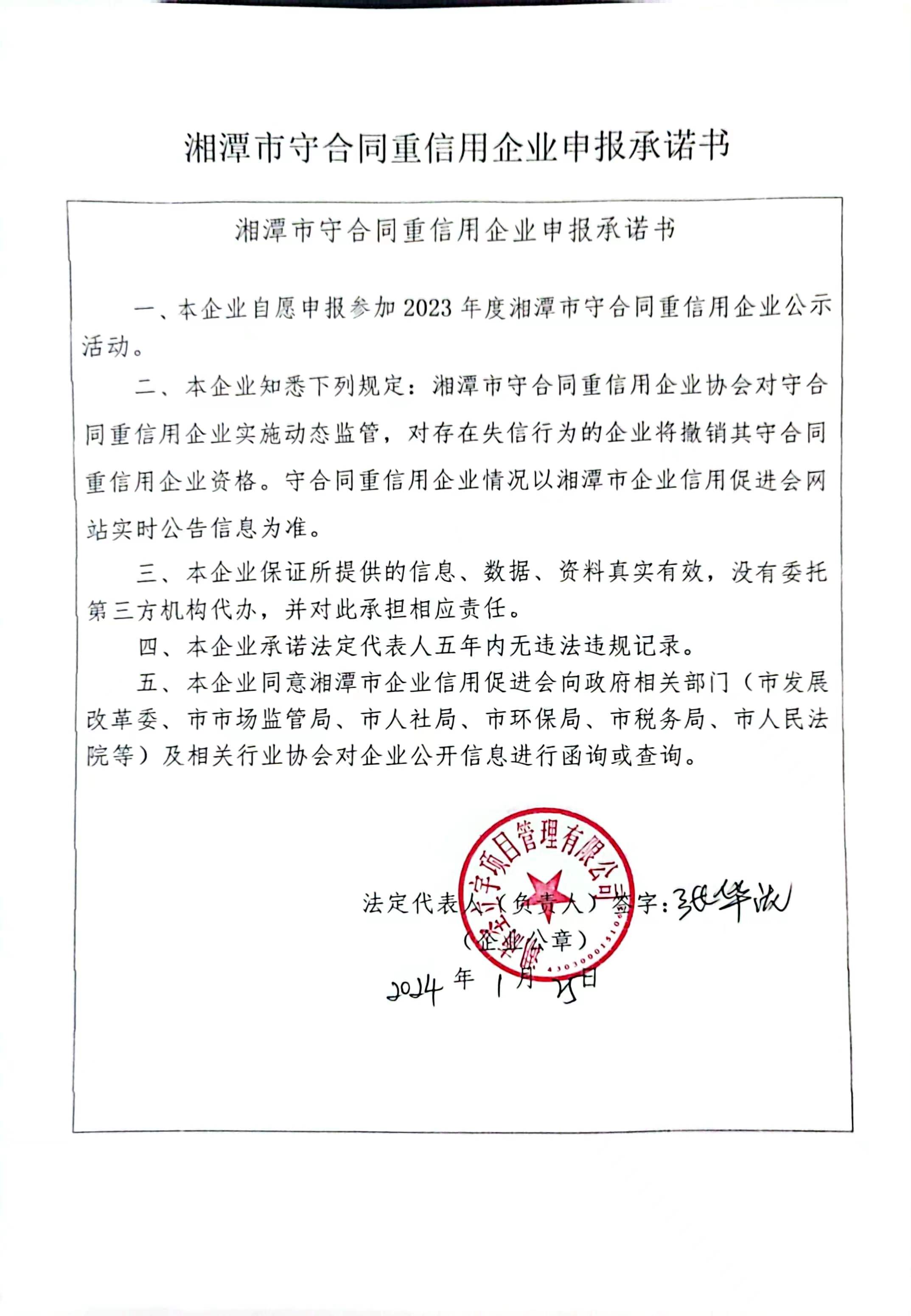 本企業(yè)根據(jù)《湘潭市守合同重信用企業(yè)申報規(guī)定》等編制 2023 年度企業(yè)信用報告書,并保證本報告書內(nèi)容真實、準(zhǔn)確、完整。