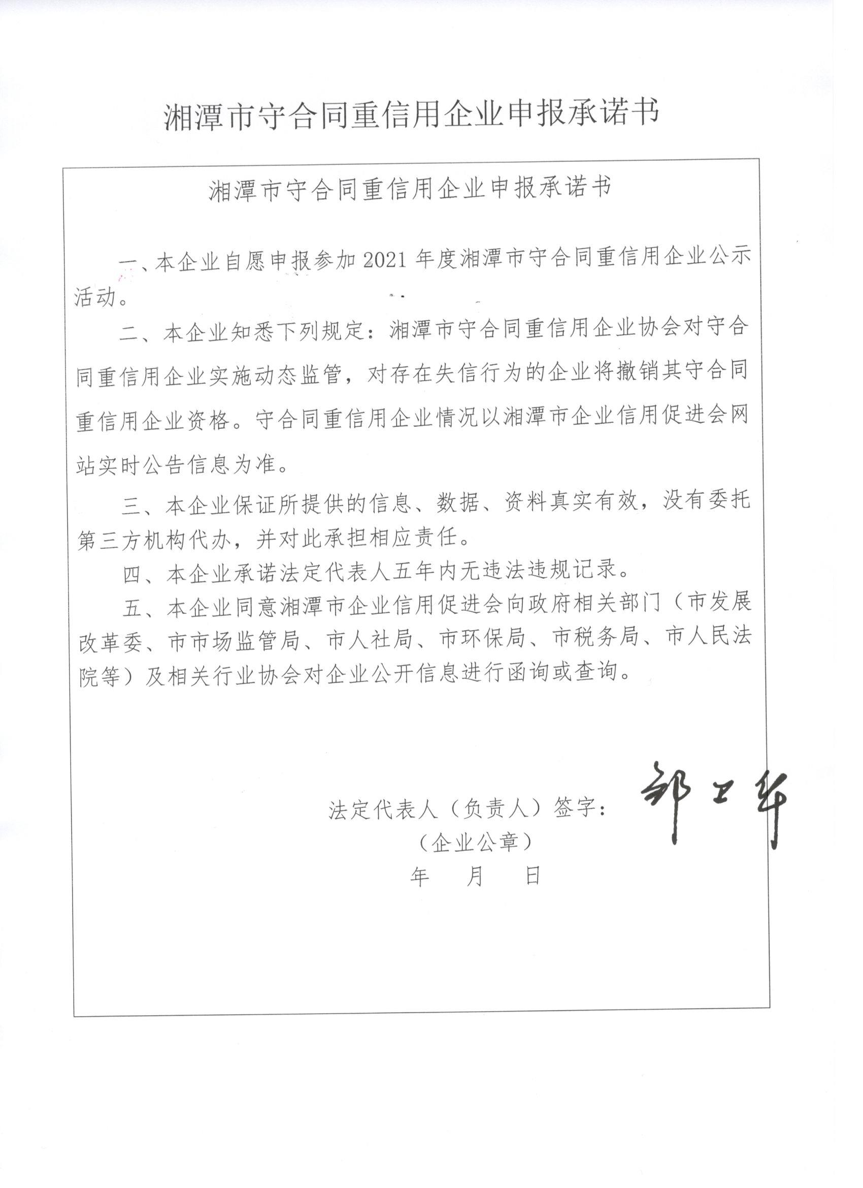 本企業(yè)根據(jù)《湘潭市守合同重信用企業(yè)申報(bào)規(guī)定》等編制 2021 年度企業(yè)信用報(bào)告書,并保證本報(bào)告書內(nèi)容真實(shí)、準(zhǔn)確、完整。