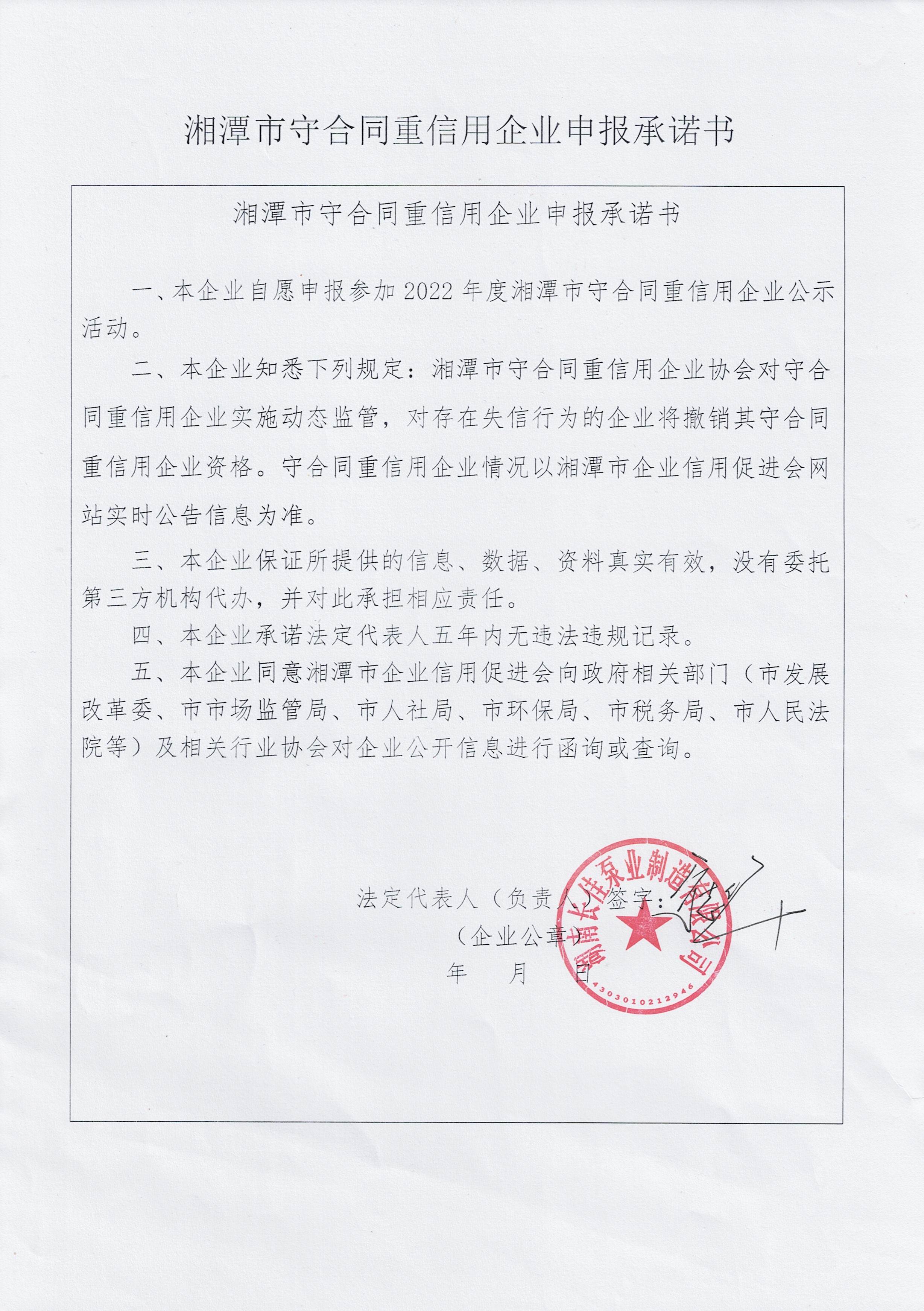 本企業(yè)根據(jù)《湘潭市守合同重信用企業(yè)申報規(guī)定》等編制 2022 年度企業(yè)信用報告書,并保證本報告書內(nèi)容真實、準確、完整。
