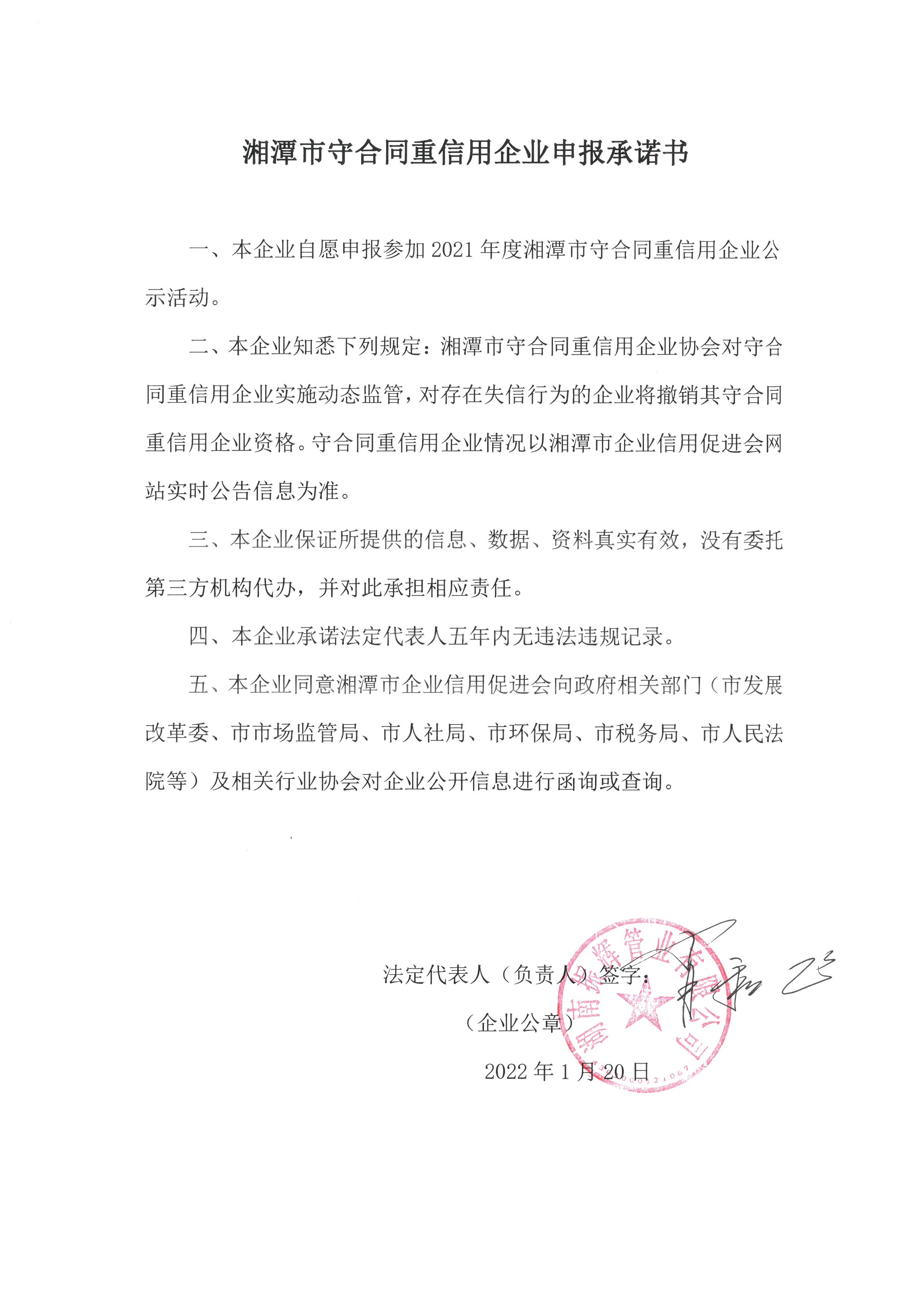 本企業(yè)根據(jù)《湘潭市守合同重信用企業(yè)申報(bào)規(guī)定》等編制 2021 年度企業(yè)信用報(bào)告書(shū),并保證本報(bào)告書(shū)內(nèi)容真實(shí)、準(zhǔn)確、完整。