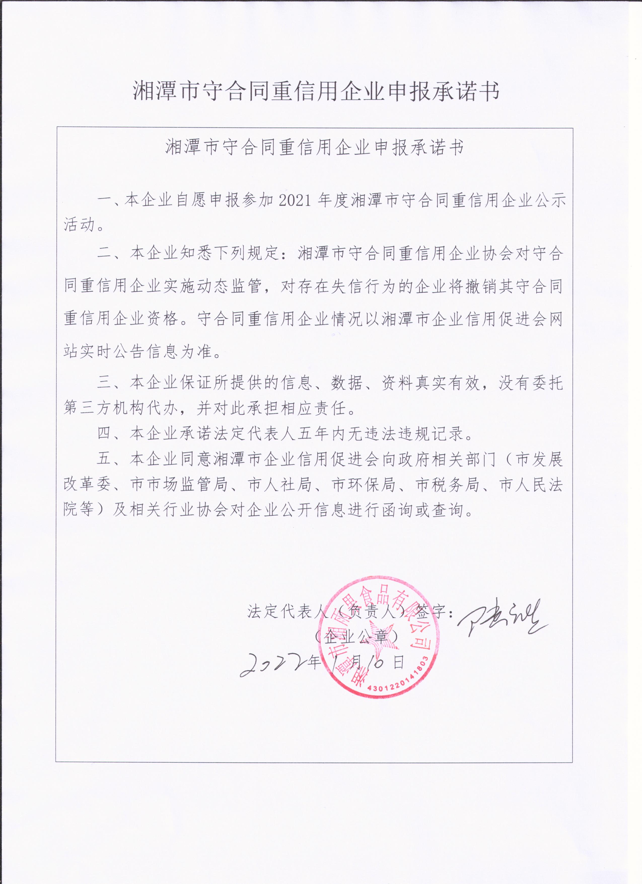 本企業(yè)根據(jù)《湘潭市守合同重信用企業(yè)申報(bào)規(guī)定》等編制 2021 年度企業(yè)信用報(bào)告書,并保證本報(bào)告書內(nèi)容真實(shí)、準(zhǔn)確、完整。
